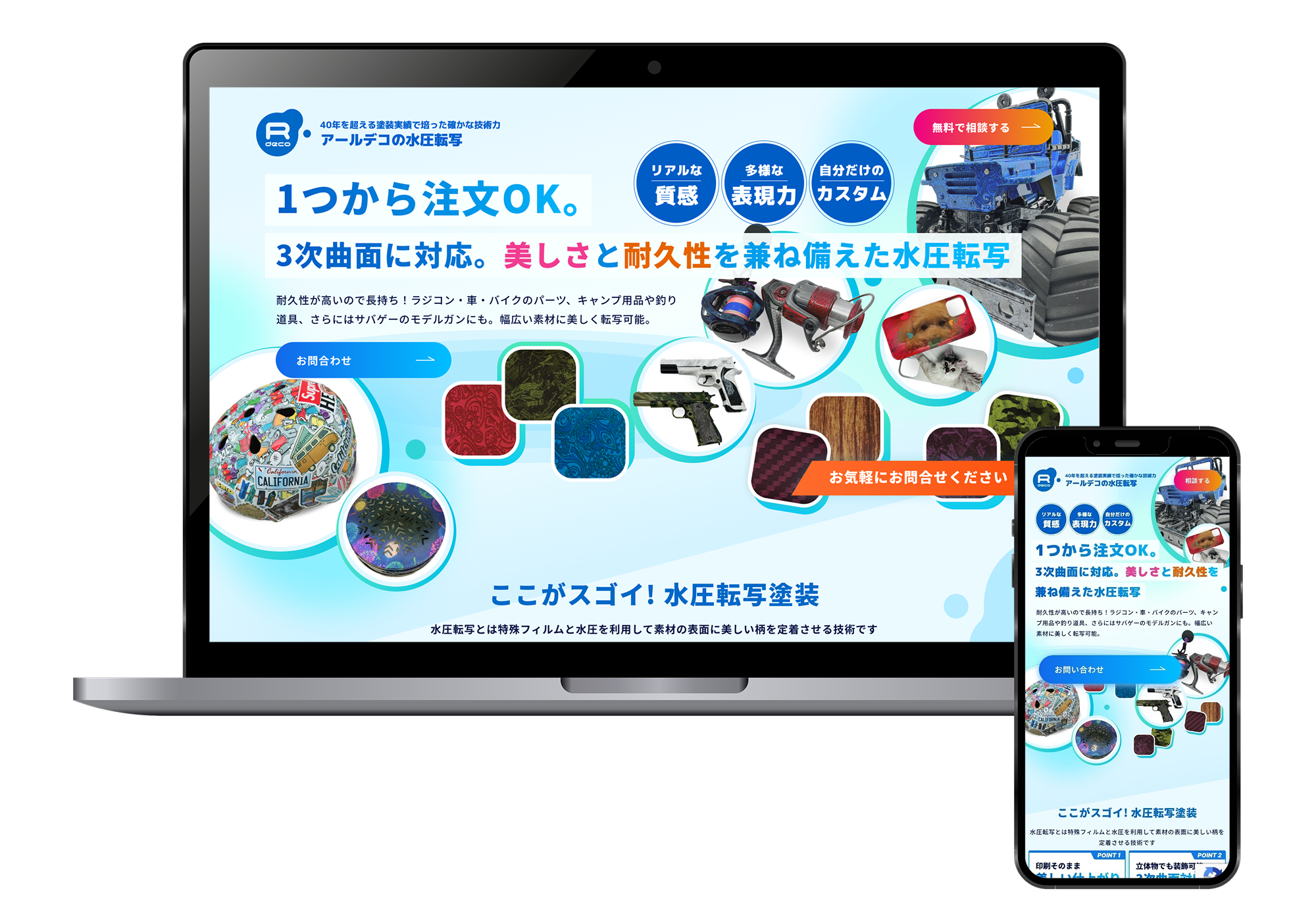 八尾市で塗装事業を展開する理化工業株式会社が新たに始動する水圧転写事業部「アールデコ」のランディングページおよび販促チラシを制作いたしました。 3次曲面OK。美しさと耐久性を兼ね備えた水圧転写塗装カスタム- アールデコ